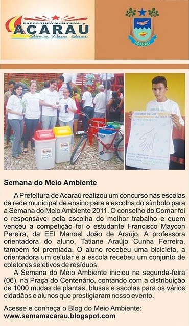 Venho através deste, informar e ao mesmo tempo convidar para a abertura da Semana de Meio Ambiente de Acaraú 2011.